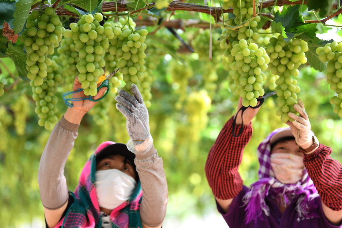 Farmers pick fresh grapes in Huailai county, Zhangjiakou city, north China's Hebei Province, on Aug. 8, the first day of autumn on the Chinese lunar calendar. (Photo/Sun Huijun)