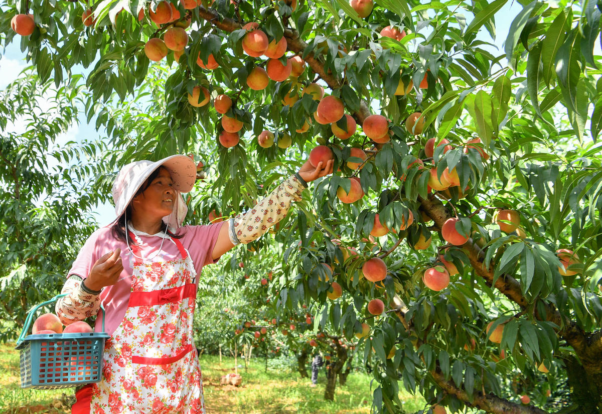 A farmer picks peaches at an orchard in Yongle township, Nanming district of Guiyang city, southwest China's Guizhou Province. (Photo/Qiao Qiming)