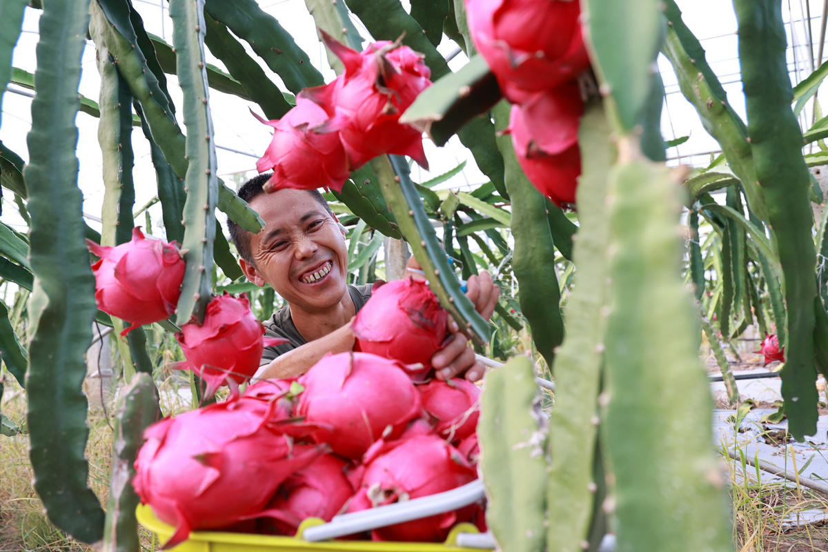 A farmer picks dragon fruits at a farm in Yangjia town, Fucheng district of Mianyang city, southwest China's Sichuan Province, on Aug. 8, the first day of autumn on the Chinese lunar calendar. (Photo/Chen Dongdong)