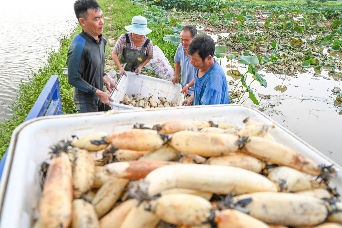 Villagers harvest lotus roots at a lotus pond in Guanfu village, Huangtugang town, Zhangshu city, east China's Jiangxi Province, on Aug. 7. (Photo/Bao Gansheng)