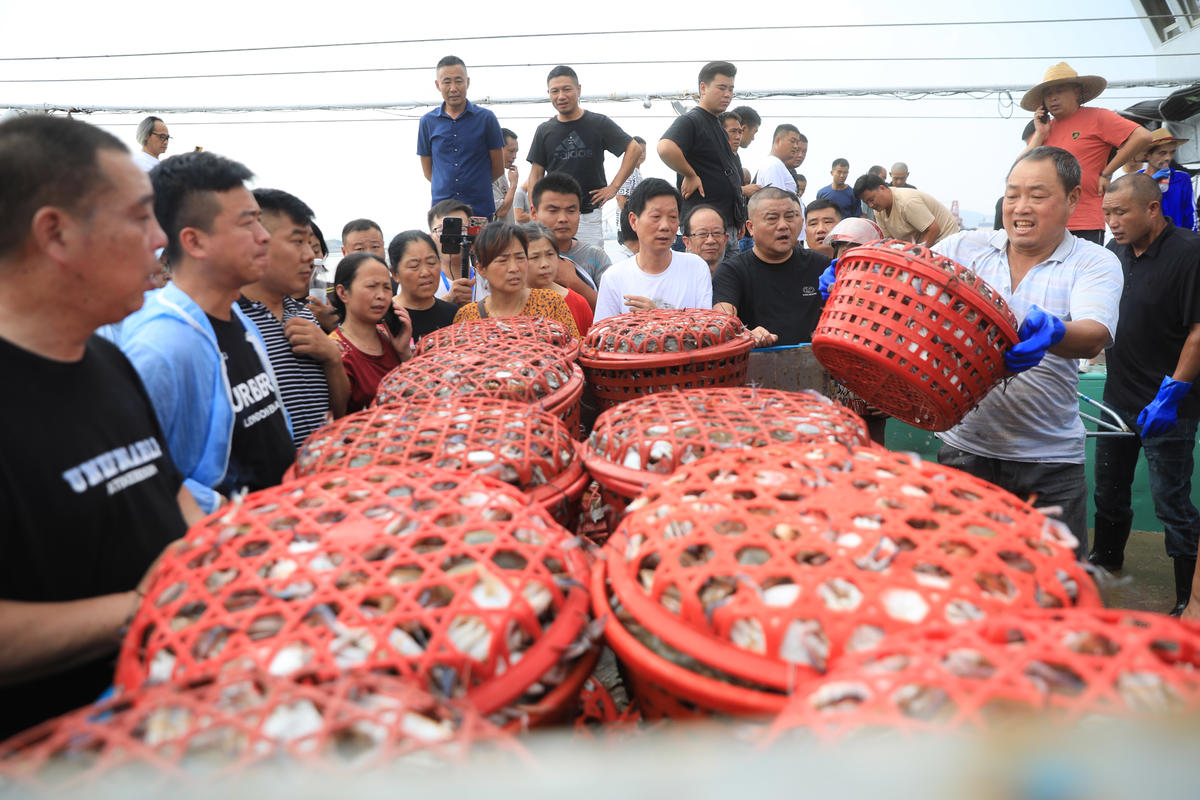 Workers unload swimming crabs at a dock in an aquatic products market in east China's Zhejiang Province on Aug. 7. (Photo/Chen Yongjian)