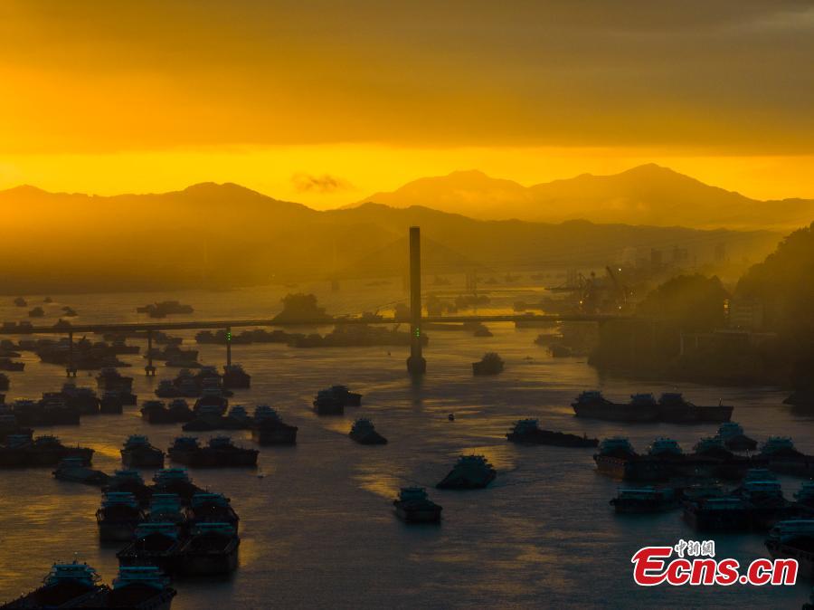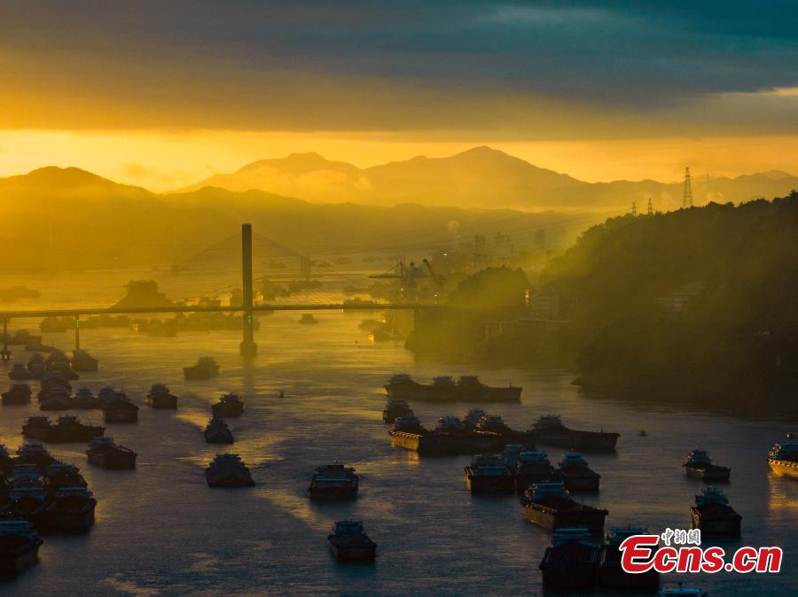 Cargo ships sail on Xijiang River under the shining morning glow, creating a golden scenery in Wuzhou, south China's Guangxi Zhuang Autonomous Region, Aug. 8, 2023. (Photo: China News Service/He Wenhua)
