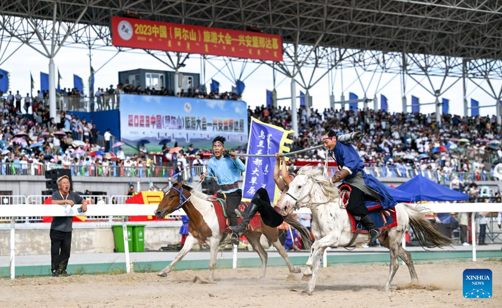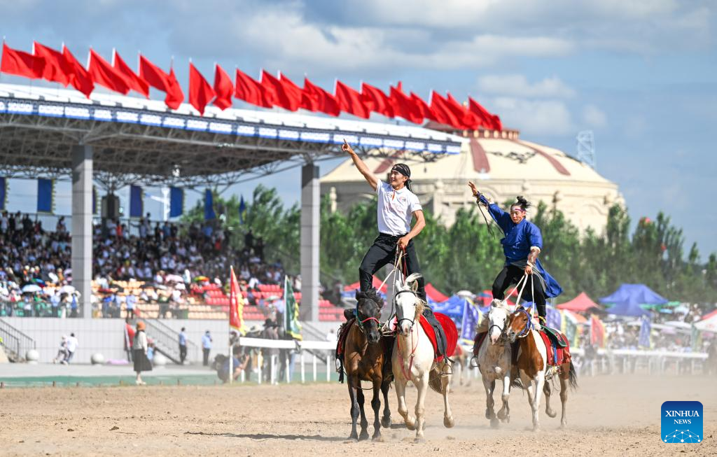 Performers stunt at the opening ceremony of a Nadam fair in Horqin Right Wing Front Banner, Hinggan League, north China's Inner Mongolia Autonomous Region, Aug. 9, 2023. A Nadam fair kicked off here on Wednesday and will last till Aug. 12. A variety of activities as horse racing, wrestling competition, archery contest and music festival will be held during the event. (Xinhua/Bei He)