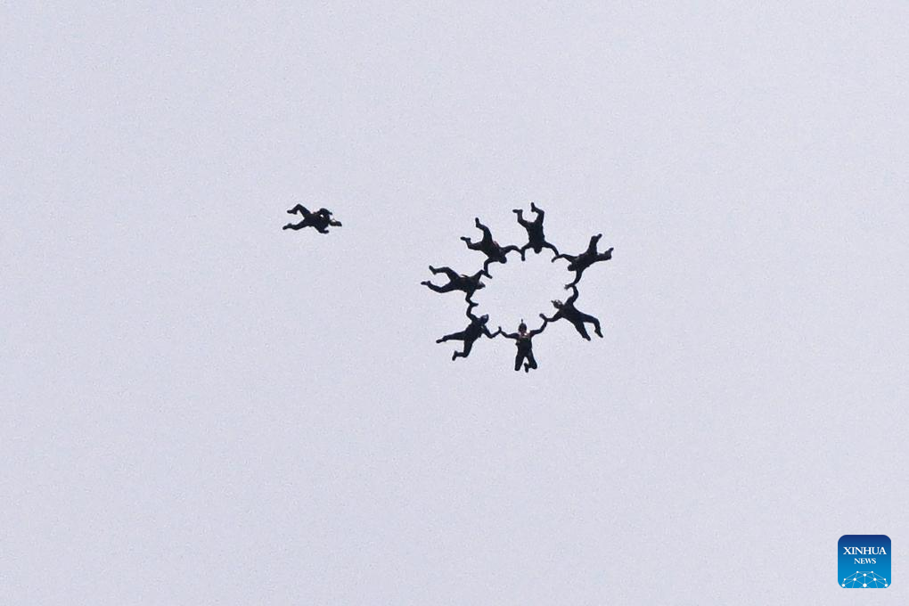 Skydivers of "Red Lions" team perform during the National Day Parade at Singapore's Padang on Aug. 9, 2023. Singapore held a National Day Parade on Wednesday to celebrate its 58th anniversary at Padang, an open playing field near the iconic Marina Bay, with a military show, performances and fireworks. (Photo by Then Chih Wey/Xinhua)