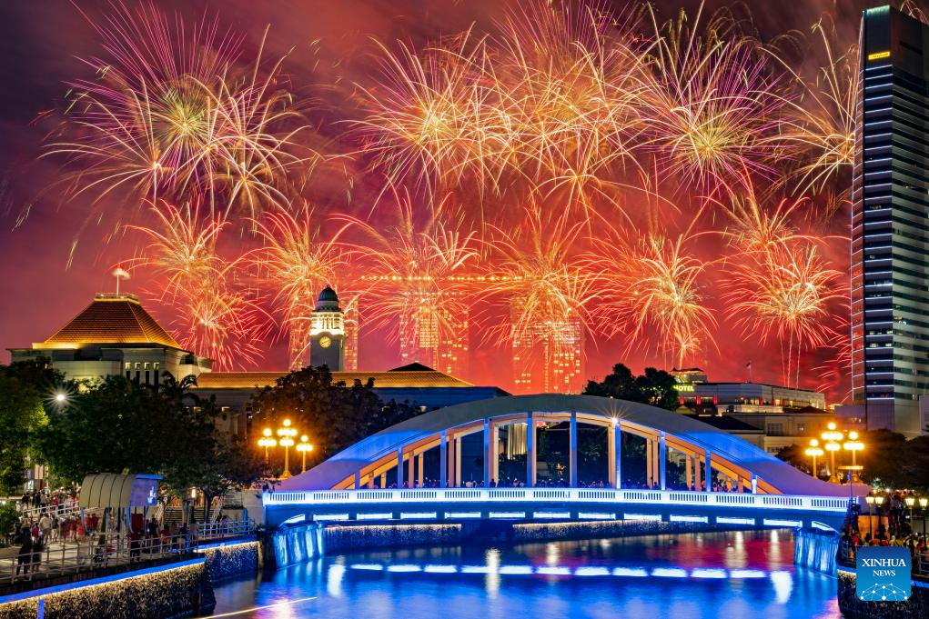 Fireworks light up the sky during the National Day Parade at Singapore's Padang on Aug. 9, 2023. Singapore held a National Day Parade on Wednesday to celebrate its 58th anniversary at Padang, an open playing field near the iconic Marina Bay, with a military show, performances and fireworks. (Photo by Then Chih Wey/Xinhua)