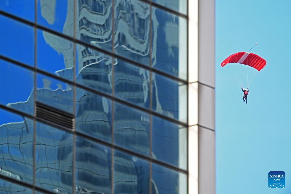 A skydiver of "Red Lions" team performs during the National Day Parade at Singapore's Padang on Aug. 9, 2023. Singapore held a National Day Parade on Wednesday to celebrate its 58th anniversary at Padang, an open playing field near the iconic Marina Bay, with a military show, performances and fireworks. (Photo by Then Chih Wey/Xinhua)