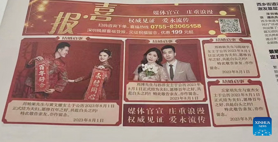 YINCHUAN, Aug. 9 (Xinhua) -- Sun Guotai, 29, and his wife surnamed Yang tied the knot on July 25, and on the big day, their marriage announcement appeared in the Shenzhen Evening News, a local newspaper published from their hometown Shenzhen in south China's Guangdong Province.