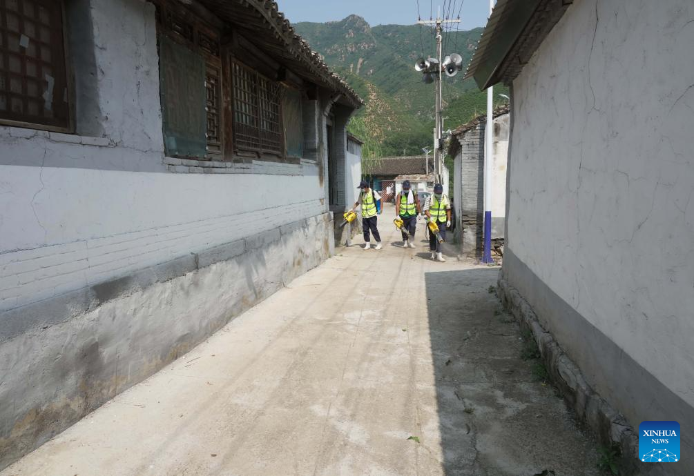 People conduct disinfection in Nanzhuang Village of Jiulong Town, Laishui County, north China's Hebei Province, Aug. 9, 2023. Some villages in Laishui County encountered traffic and communication disruptions caused by the recent heavy rainfall brought by Typhoon Doksuri. At present, the local authorities is conducting environmental disinfection to prevent epidemics after the floods. (Xinhua/Yang Shiyao)