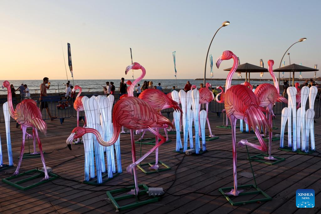 People visit the Chinese Lantern Exhibition in Tel Aviv, Israel, on Aug. 9, 2023. The Chinese Lantern Exhibition in Tel Aviv features several sets of lanterns which are crafted by a team from Zigong City of southwest China's Sichuan Province. (Xinhua/Chen Junqing)