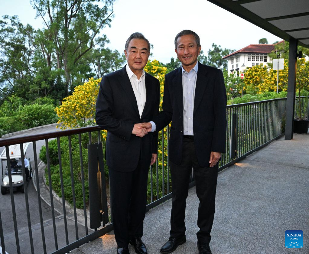 SINGAPORE, Aug. 10 (Xinhua) -- Chinese Foreign Minister Wang Yi, who is also a member of the Political Bureau of the Communist Party of China Central Committee, here on Thursday met with Singaporean Minister for Foreign Affairs Vivian Balakrishnan, with the two sides pledging to keep promoting the Belt and Road construction.