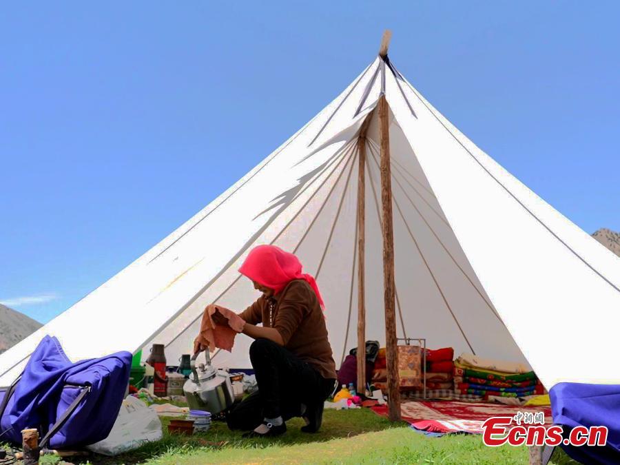 A herder sets up a tent on the way to summer pasture in Dulan County of Haixi Mongolian-Tibetan Autonomous Prefecture, northwest China's Qinghai Province. (Photo: China News Service/Mo Jiayin)