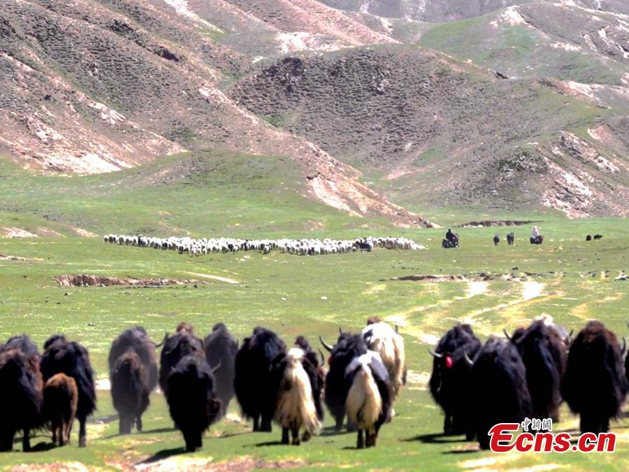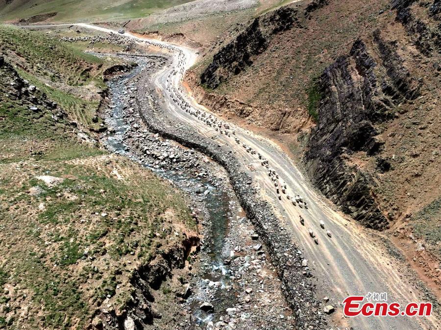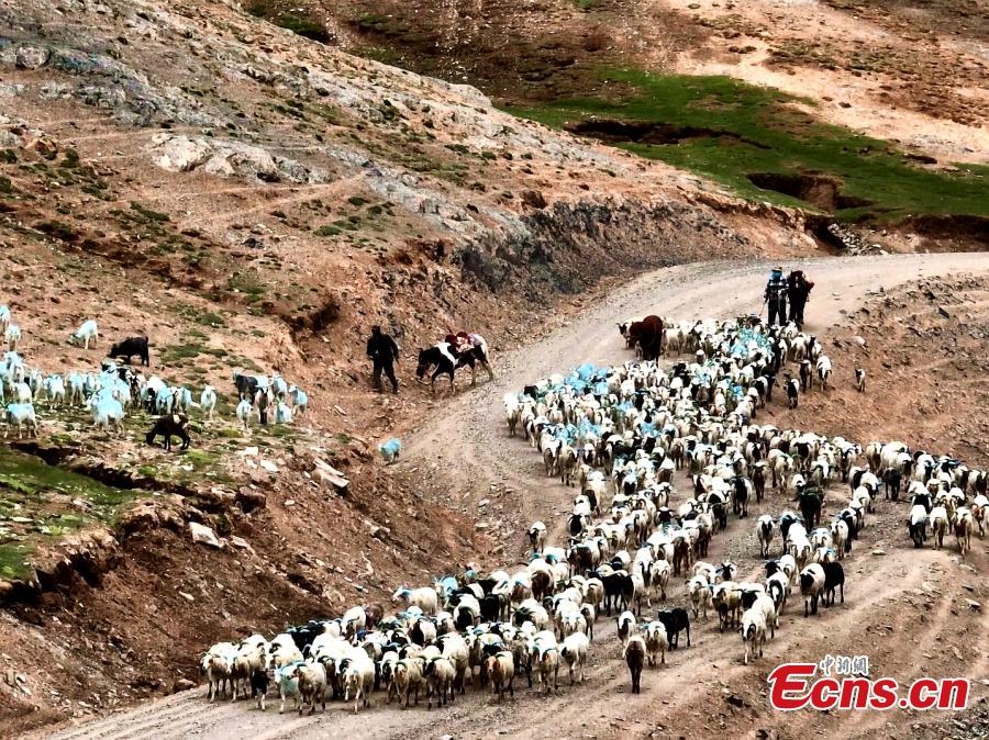 Livestock are on their way to summer pasture in Dulan County of Haixi Mongolian-Tibetan Autonomous Prefecture, northwest China's Qinghai Province. (Photo: China News Service/Mo Jiayin)