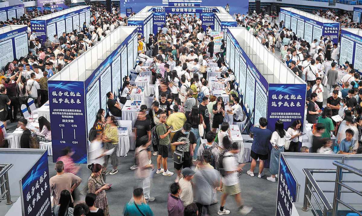 Job seekers look for employment at a career fair for graduates unable to land a job in Wuhan, Hubei province, on Thursday. A total of 4,100 positions from 156 enterprises were on offer. ZHANG CHaNG/CHINA NEWS SERVICE