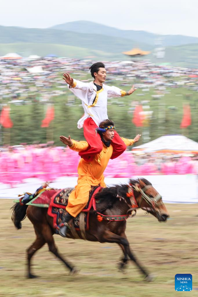 This photo taken on Aug. 10, 2023 shows an equestrian show staged in celebration of the 70th anniversary of the founding of Gannan Tibetan Autonomous Prefecture in Hezuo City, northwest China's Gansu Province. A celebration event was held here to mark the 70th anniversary of the founding of Gannan Tibetan Autonomous Prefecture. (Xinhua/Ma Xiping)