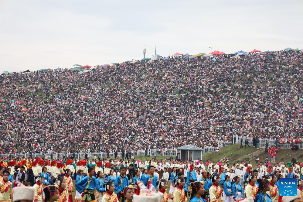 This photo taken on Aug. 10, 2023 shows a scene of the celebration event marking the 70th anniversary of the founding of Gannan Tibetan Autonomous Prefecture in Hezuo City, northwest China's Gansu Province. A celebration event was held here to mark the 70th anniversary of the founding of Gannan Tibetan Autonomous Prefecture. (Xinhua/Ma Xiping)