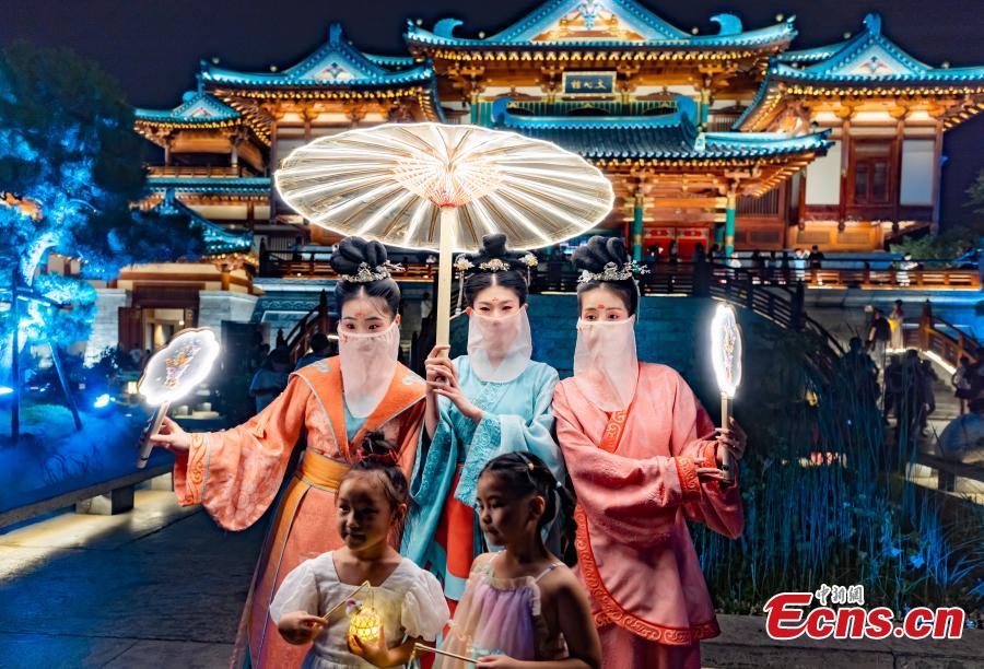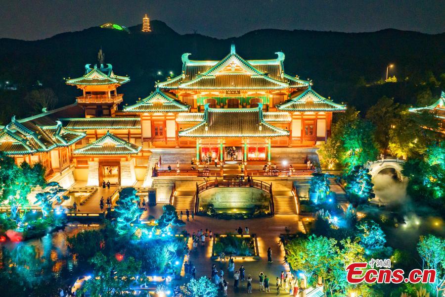 Illuminated Yanjili ancient town reproduces the grandeur of a capital of six dynasties in Nanjing, east China's Jiangsu Province, Aug. 10, 2023. (Photo: China News Service/Yang Bo)
