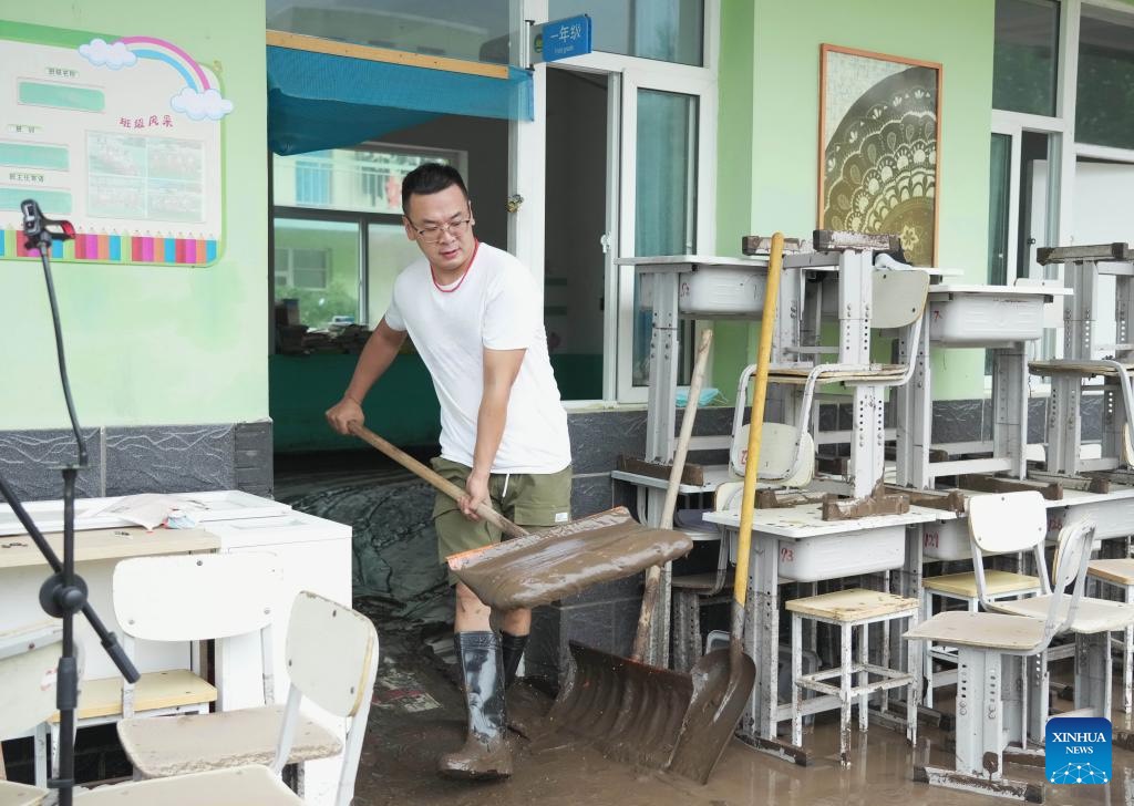 A teacher cleans up sludge at a school in Qizhongkou Town of Laishui County, north China's Hebei Province, Aug. 11, 2023. Some schools, located in the mountainous areas of Laishui County, have carried out post-flood recovery work recently. Relevant personnel have investigated schools thoroughly for potential safety hazards, cleaned campuses and carried out disinfection for epidemic prevention and control. (Xinhua/Wang Kun)