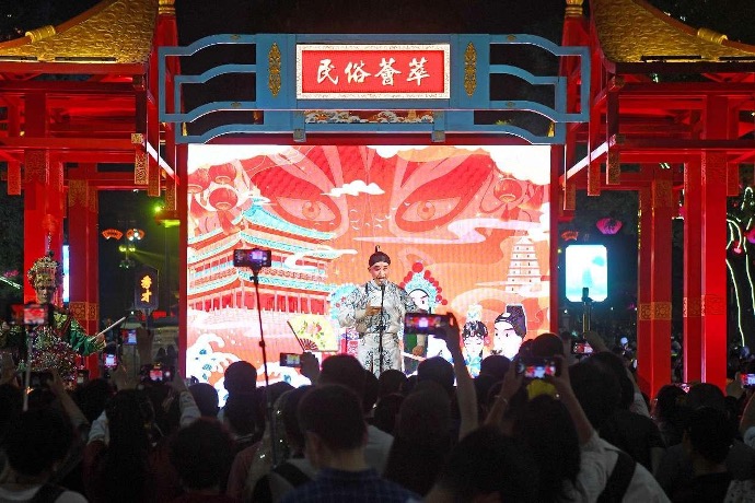 A traditional opera performance is staged at the Datang Everbright City scenic area in Xi'an, northwest China's Shaanxi province. (People's Daily Online/Sun Lijun)