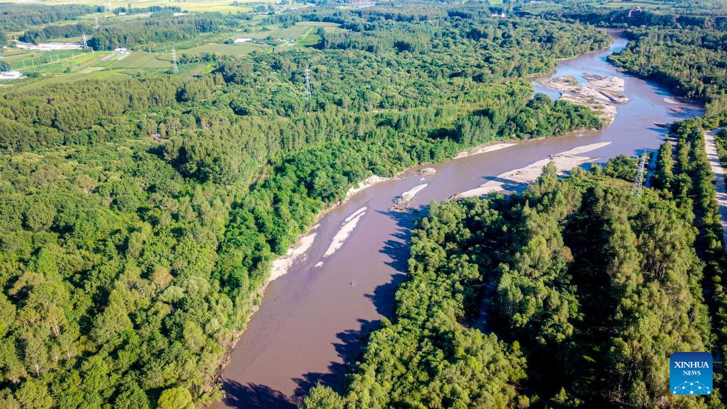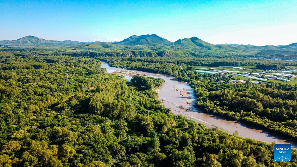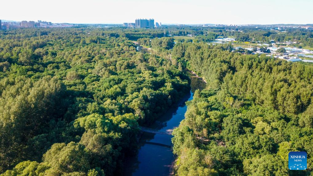 This aerial photo shows a view of the Tao'erhe National Wetland Park in Ulanhot City, north China's Inner Mongolia Autonomous Region, Aug. 13, 2023. (Xinhua/Peng Yuan)