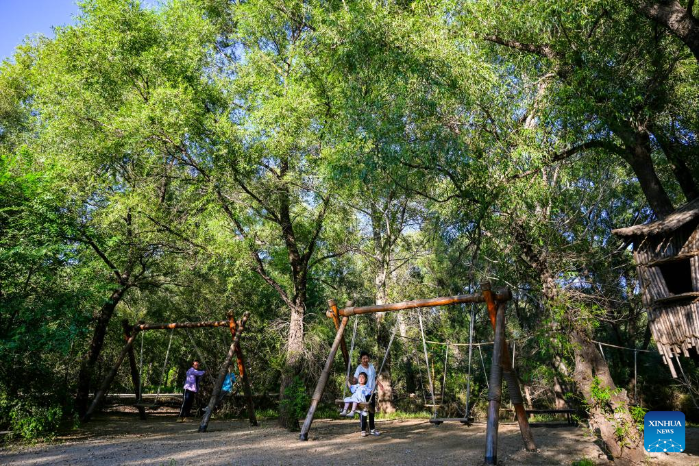 People have fun at the Tao'erhe National Wetland Park in Ulanhot City, north China's Inner Mongolia Autonomous Region, Aug. 13, 2023. (Xinhua/Peng Yuan)