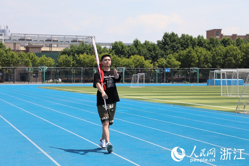 A photo shows Liu Pinyuan, a flag-raising volunteer for the 19th Hangzhou Asian Games, practicing on a campus athletic field. (People's Daily Online/Fang Pengyimeng)