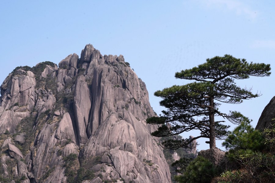 This photo taken on April 10, 2023 shows the Lianhua Peak and a pine tree on Huangshan Mountain in east China's Anhui Province. (Xinhua/Ma Ning)