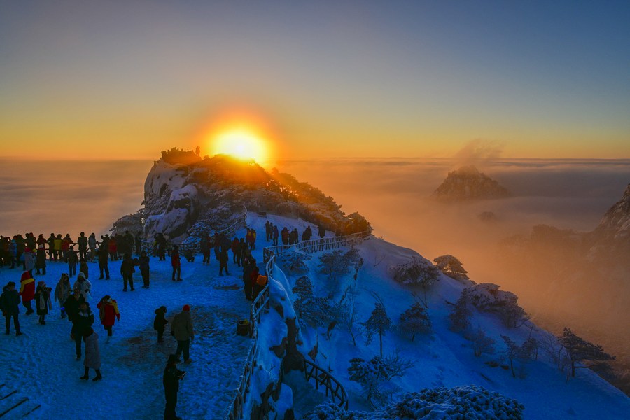 Tourists view the sunrise on Huangshan Mountain, Dec. 31, 2018. (Photo by Shui Congze/Xinhua)