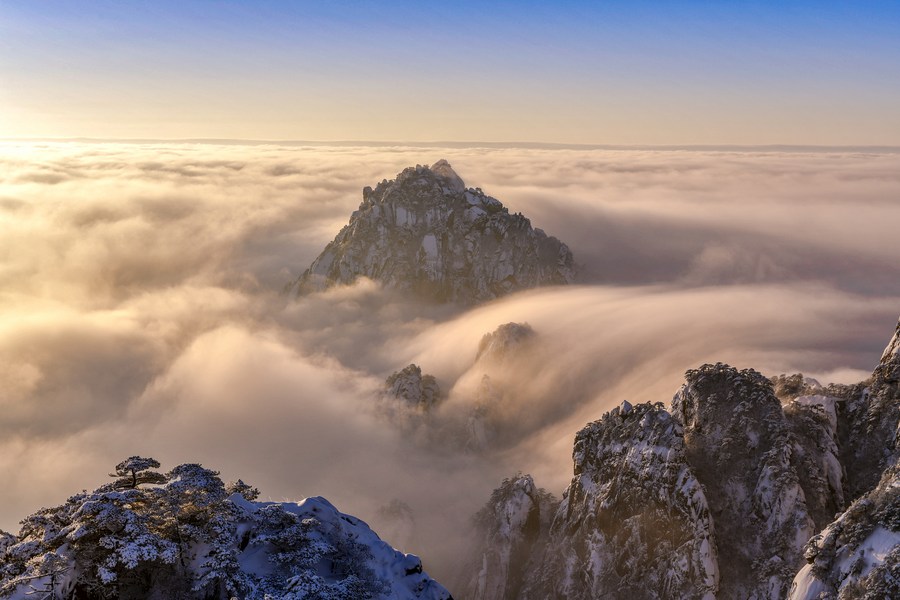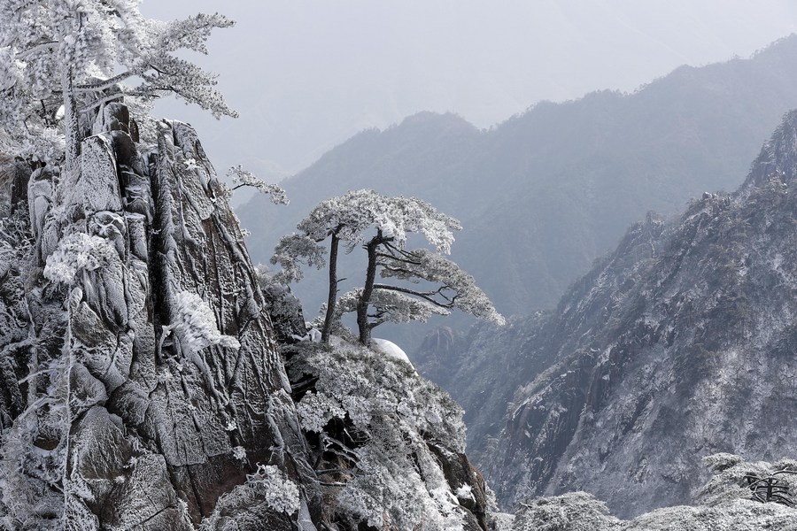 Photo taken on Nov. 22, 2021 shows the snowy scenery of Huangshan Mountain. (Photo by Shi Yalei/Xinhua)