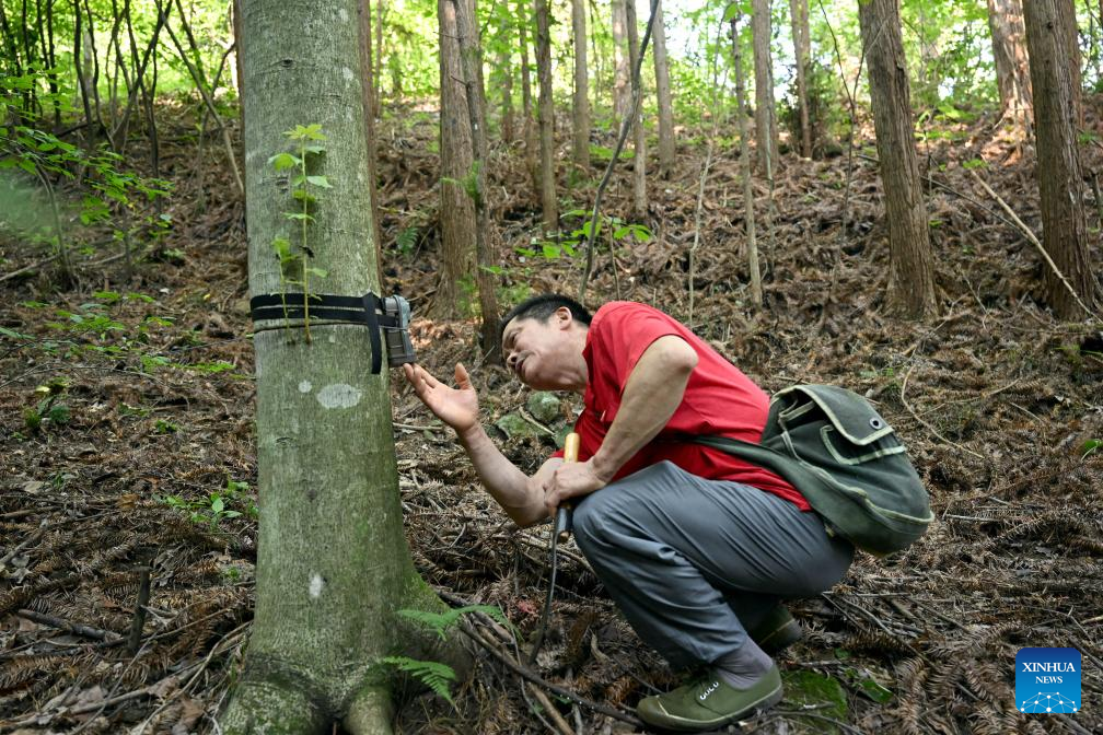 Wang Kedong checks an infrared camera while patrolling at Tiantangzhai management station in Anhui Tianma National Nature Reserve, east China's Anhui Province, Aug. 12, 2023. (Xinhua/Huang Bohan)