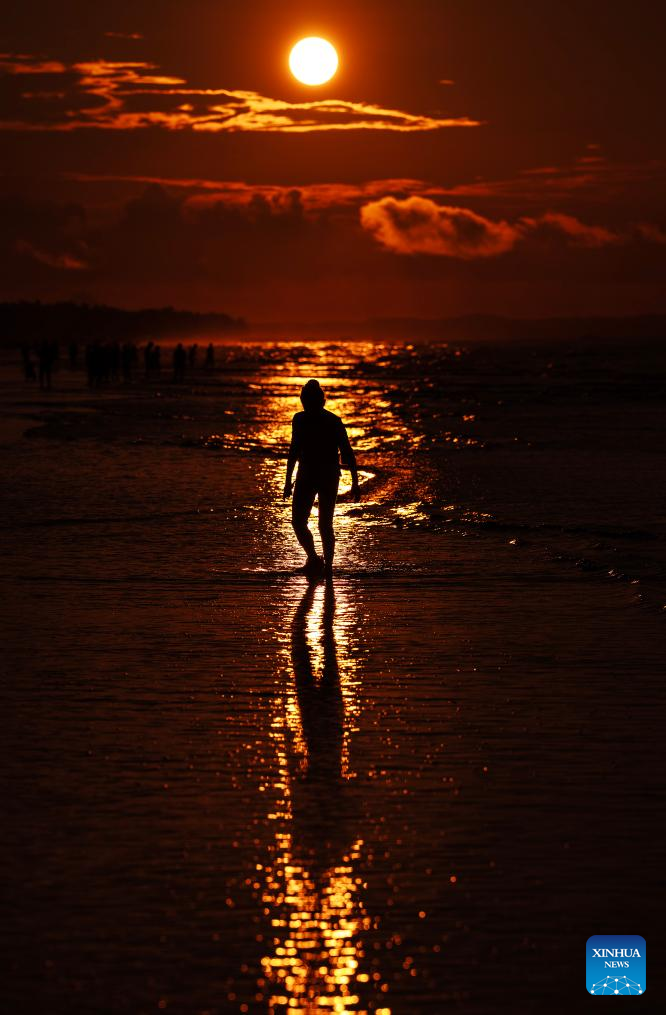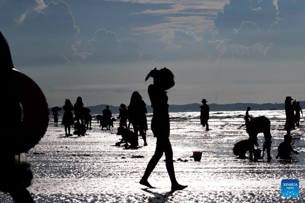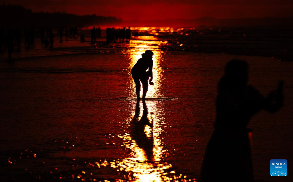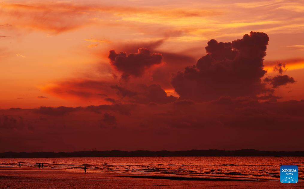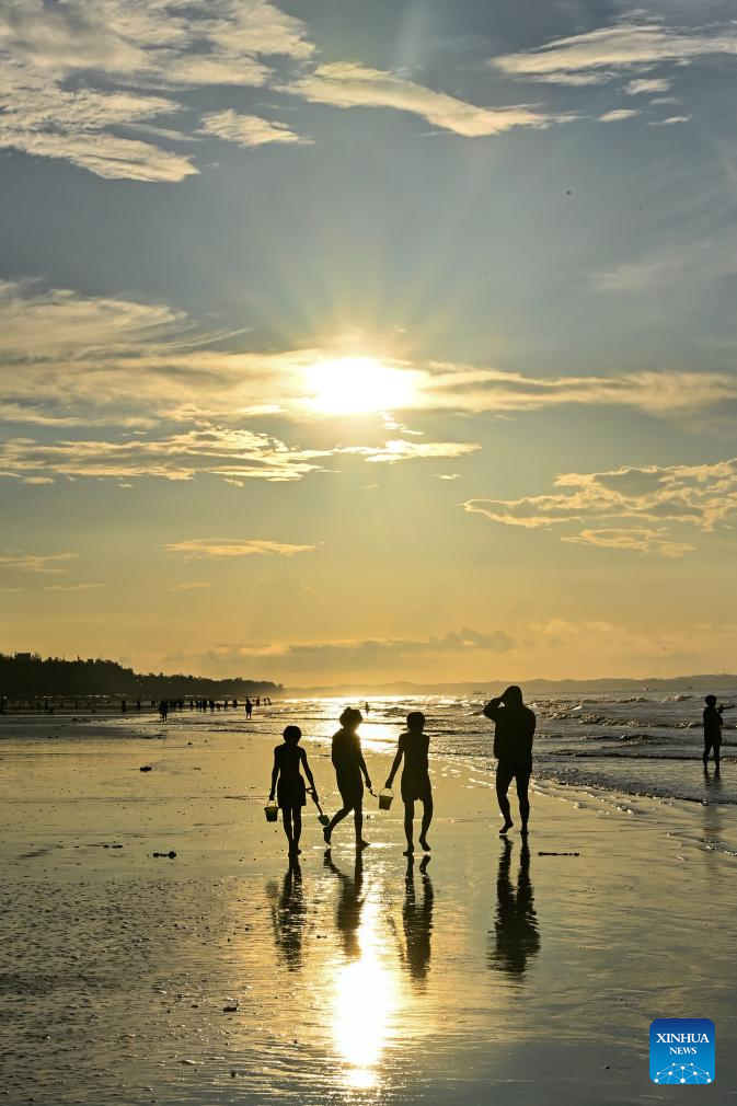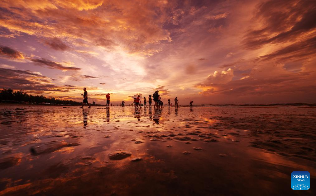 Tourists have fun in the sunrise at Jintan beach in Dongxing, south China's Guangxi Zhuang Autonomous Region, Aug. 14, 2023. Jintan beach, which is located in the southern part of the Wanwei Island, has a coastline of 15 kilometers and is named after its golden sand color. (Xinhua/Zhou Hua)