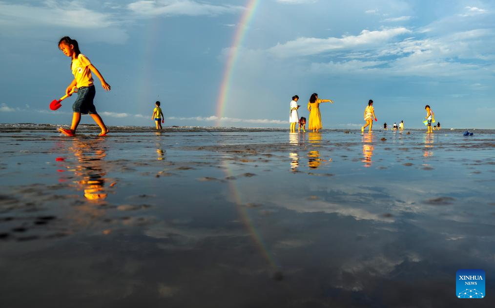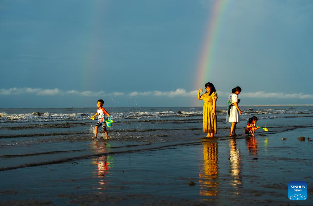 Tourists have fun as a rainbow appears in the sky at Jintan beach in Dongxing, south China's Guangxi Zhuang Autonomous Region, Aug. 14, 2023. Jintan beach, which is located in the southern part of the Wanwei Island, has a coastline of 15 kilometers and is named after its golden sand color. (Xinhua/Fei Maohua)
