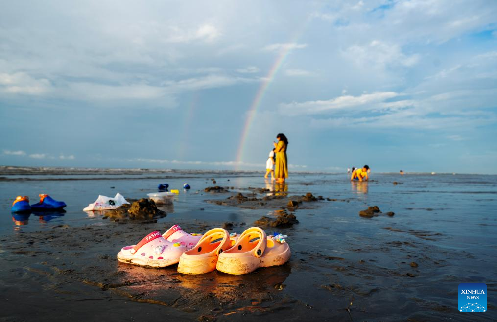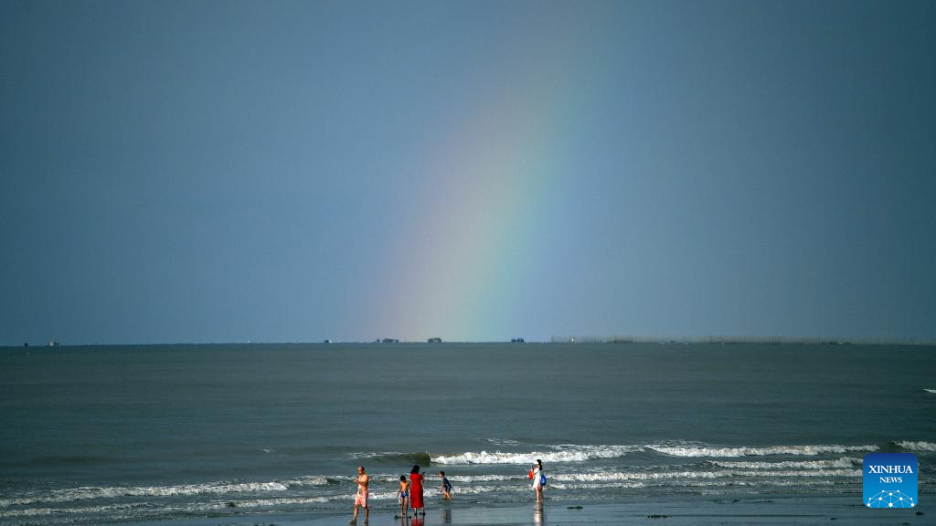 Tourists have fun as a rainbow appears in the sky at Jintan beach in Dongxing, south China's Guangxi Zhuang Autonomous Region, Aug. 14, 2023. Jintan beach, which is located in the southern part of the Wanwei Island, has a coastline of 15 kilometers and is named after its golden sand color. (Xinhua/Zhang Ailin)