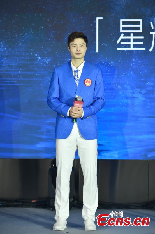 An athlete models the men's official Team China opening ceremony parade uniforms for the upcoming Hangzhou Asian Games in Beijing, Aug. 15, 2023. (Photo: China News Network/Li Jun)