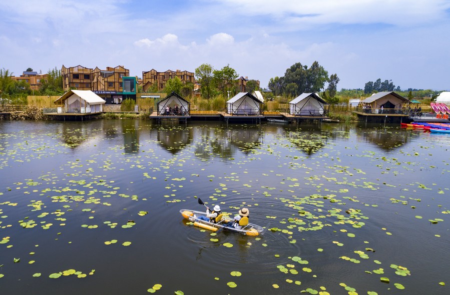 Tourists paddle a boat in Shangsuan Town of Kunming City, southwest China's Yunnan Province, April 30, 2023. (Xinhua/Chen Xinbo)