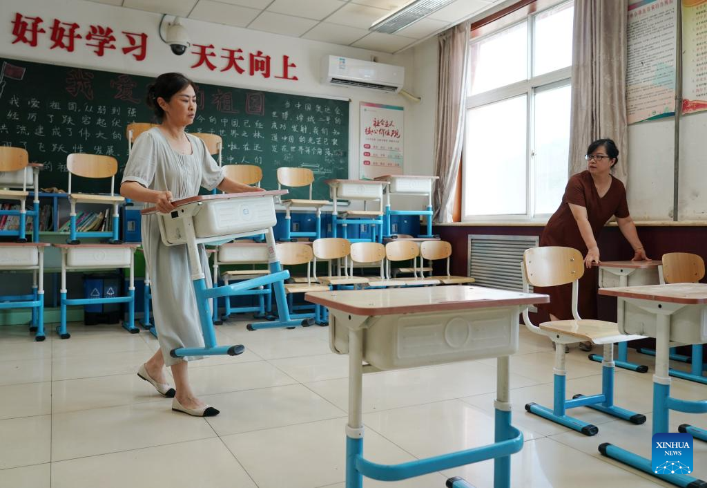 Staff members arrange a classroom at Miaofengshan Ethnic School in Mentougou District in Beijing, capital of China, Aug. 14, 2023. Schools damaged by heavy rains in Mentougou and Fangshan districts are making every effort to carry out post-disaster reconstruction and prepare for the upcoming new semester. Various operations have been carried out according to the specific situation, including dredging, disinfection, building maintenance, etc. (Xinhua/Zhang Chenlin)