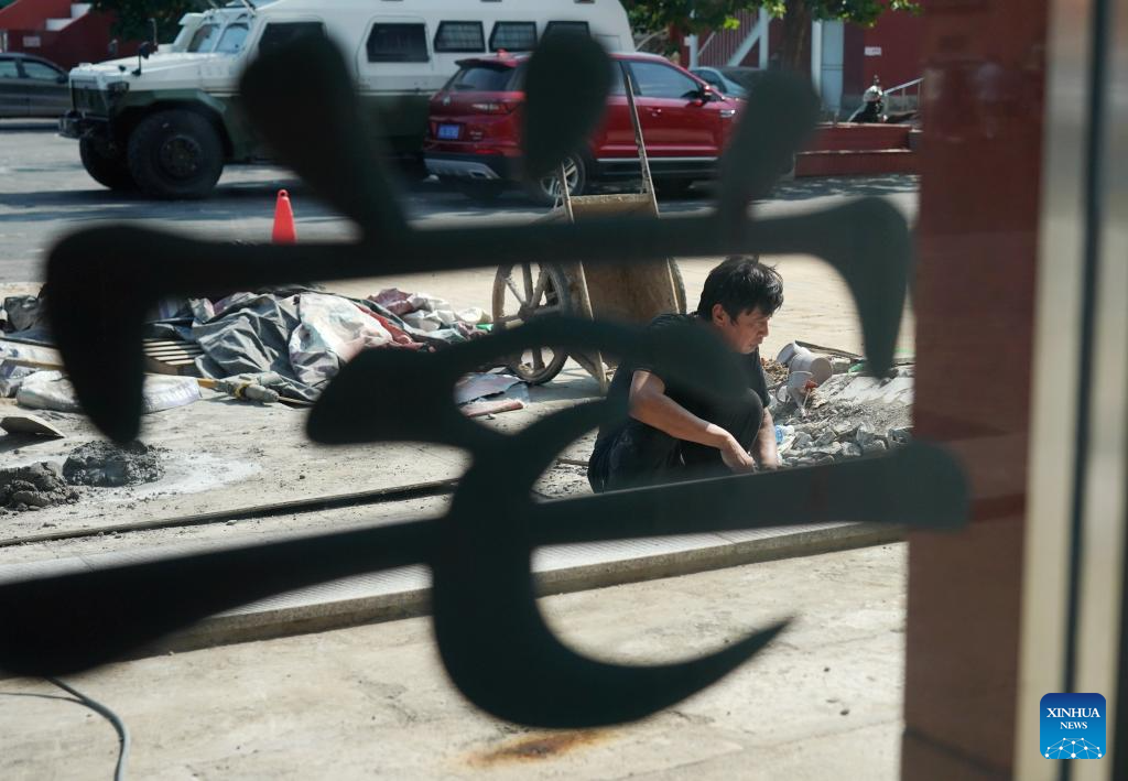 A worker works at Miaofengshan Ethnic School in Mentougou District in Beijing, capital of China, Aug. 14, 2023. Schools damaged by heavy rains in Mentougou and Fangshan districts are making every effort to carry out post-disaster reconstruction and prepare for the upcoming new semester. Various operations have been carried out according to the specific situation, including dredging, disinfection, building maintenance, etc. (Xinhua/Zhang Chenlin)