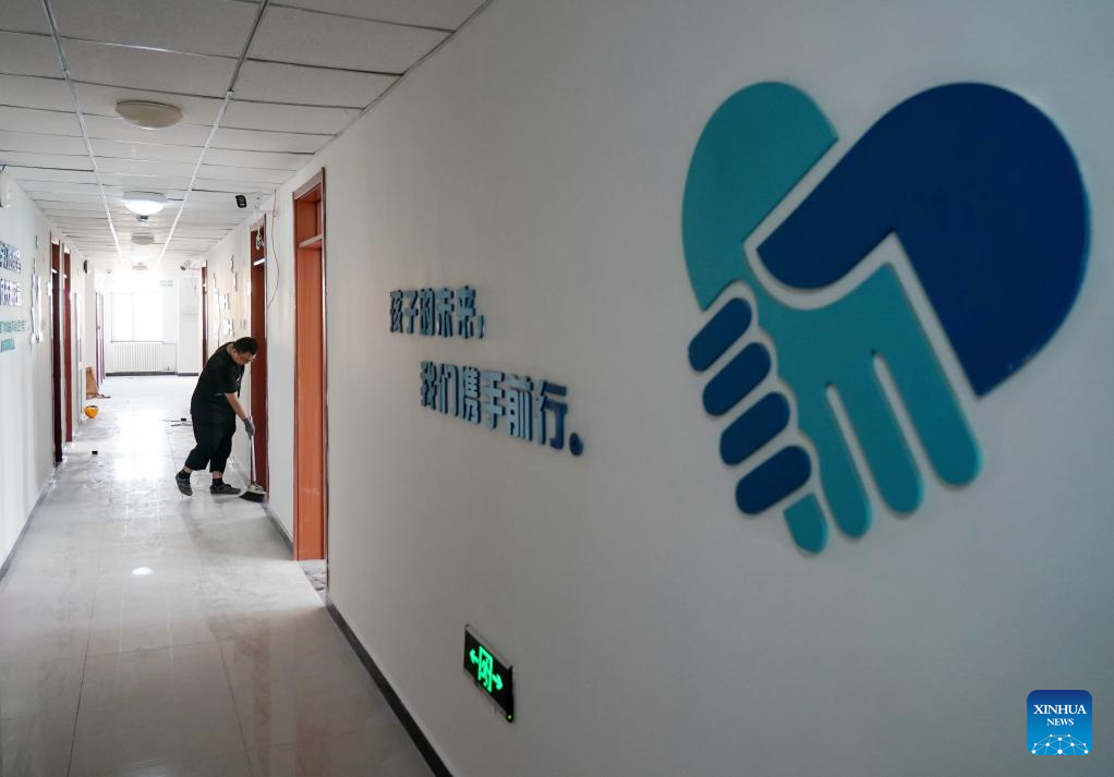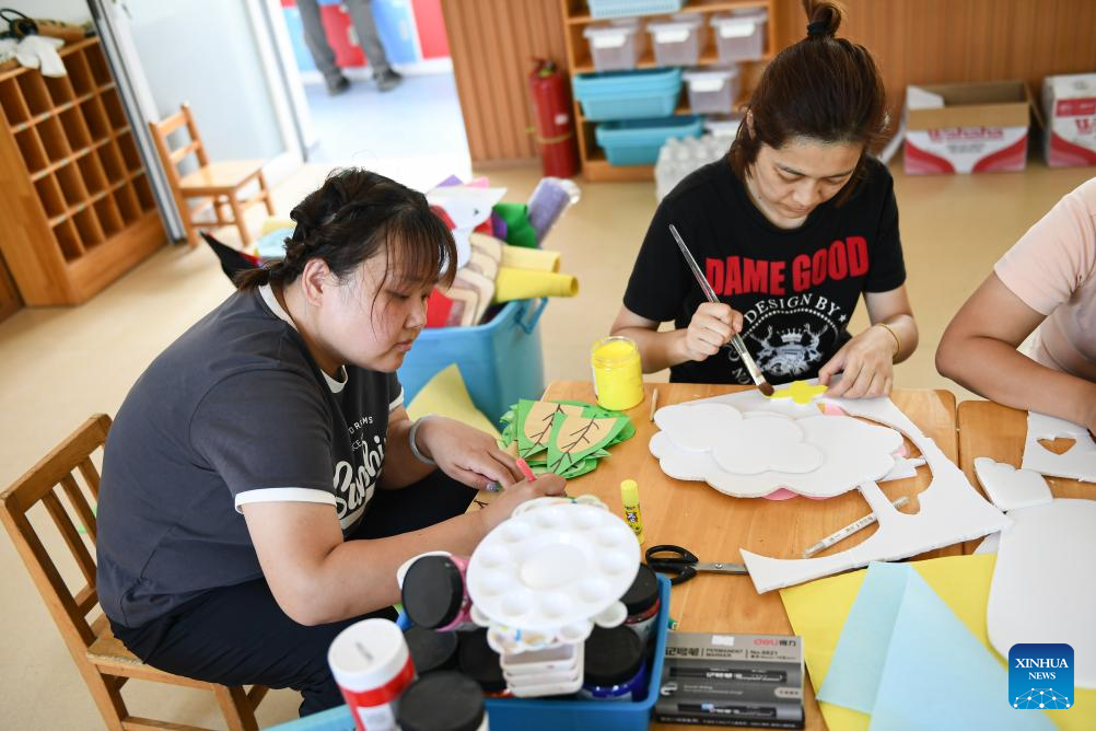 Teachers prepare decorations for the upcoming new semester at Dongzhuangzi branch of Hebei Township Central Kindergarten in Fangshan District in Beijing, capital of China, Aug. 15, 2023. Schools damaged by heavy rains in Mentougou and Fangshan districts are making every effort to carry out post-disaster reconstruction and prepare for the upcoming new semester. Various operations have been carried out according to the specific situation, including dredging, disinfection, building maintenance, etc. (Xinhua/Chen Zhonghao)