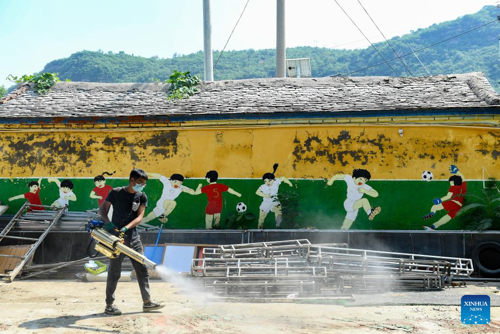 Teacher Li Xiaobo conducts disinfection at Dongzhuangzi branch of Hebei Township Central Kindergarten in Fangshan District in Beijing, capital of China, Aug. 15, 2023. Schools damaged by heavy rains in Mentougou and Fangshan districts are making every effort to carry out post-disaster reconstruction and prepare for the upcoming new semester. Various operations have been carried out according to the specific situation, including dredging, disinfection, building maintenance, etc. (Xinhua/Chen Zhonghao)