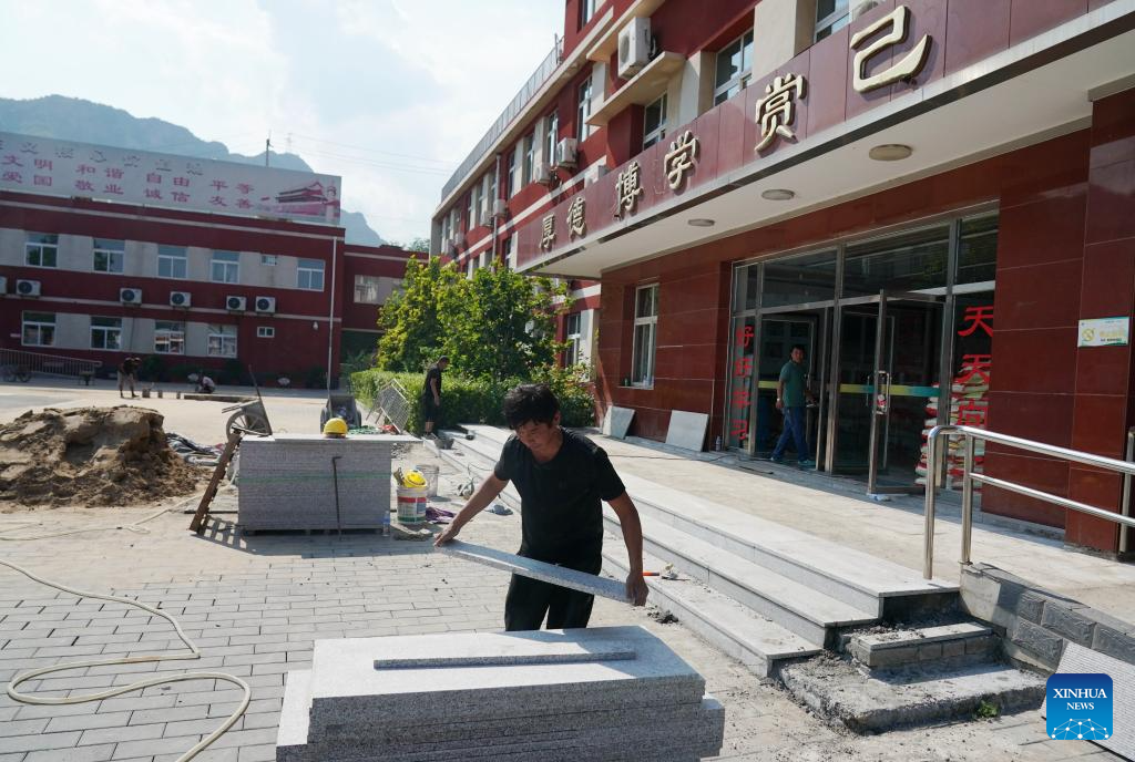 Workers work at Miaofengshan Ethnic School in Mentougou District in Beijing, capital of China, Aug. 14, 2023. Schools damaged by heavy rains in Mentougou and Fangshan districts are making every effort to carry out post-disaster reconstruction and prepare for the upcoming new semester. Various operations have been carried out according to the specific situation, including dredging, disinfection, building maintenance, etc. (Xinhua/Zhang Chenlin)