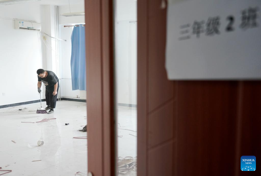 A staff member cleans a classroom at Jingshi Experimental High School in Mentougou District in Beijing, capital of China, Aug. 14, 2023. Schools damaged by heavy rains in Mentougou and Fangshan districts are making every effort to carry out post-disaster reconstruction and prepare for the upcoming new semester. Various operations have been carried out according to the specific situation, including dredging, disinfection, building maintenance, etc. (Xinhua/Zhang Chenlin)