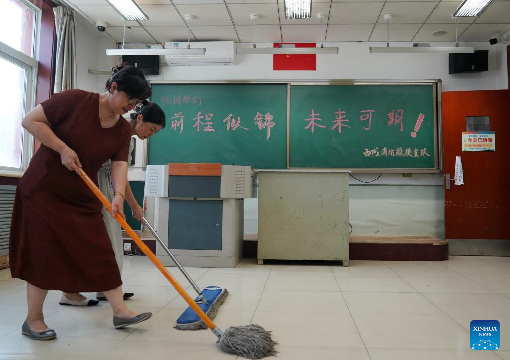 Staff members clean a classroom at Miaofengshan Ethnic School in Mentougou District in Beijing, capital of China, Aug. 14, 2023. Schools damaged by heavy rains in Mentougou and Fangshan districts are making every effort to carry out post-disaster reconstruction and prepare for the upcoming new semester. Various operations have been carried out according to the specific situation, including dredging, disinfection, building maintenance, etc. (Xinhua/Zhang Chenlin)