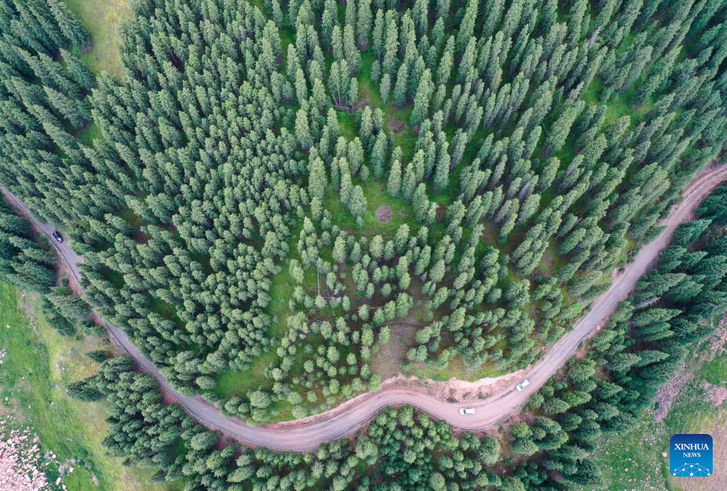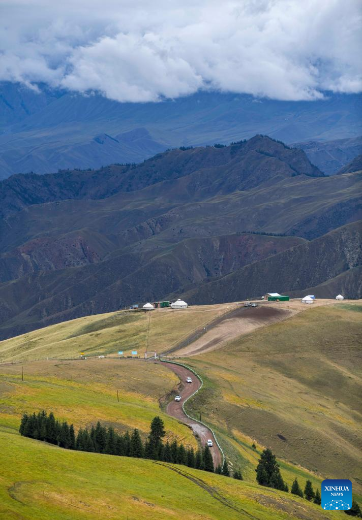 This aerial photo shows tourists driving at Solbastiao alpine pasture in the Tianshan Mountains area in Miaoergou Township of Changji, northwest China's Xinjiang Uygur Autonomous Region, Aug. 12, 2023. (Xinhua/Hu Huhu)