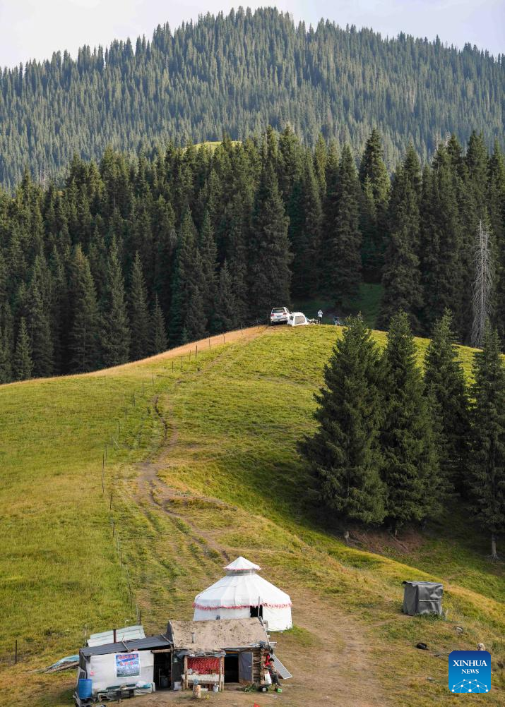 This photo taken on Aug. 13, 2023 shows a view at Solbastiao alpine pasture in the Tianshan Mountains area in Miaoergou Township of Changji, northwest China's Xinjiang Uygur Autonomous Region. (Xinhua/Hu Huhu)