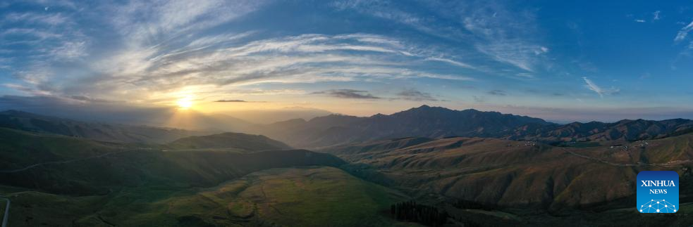 This aerial panorama photo taken on Aug. 13, 2023 shows Solbastiao alpine pasture in the Tianshan Mountains area in Miaoergou Township of Changji, northwest China's Xinjiang Uygur Autonomous Region. (Xinhua/Hu Huhu)