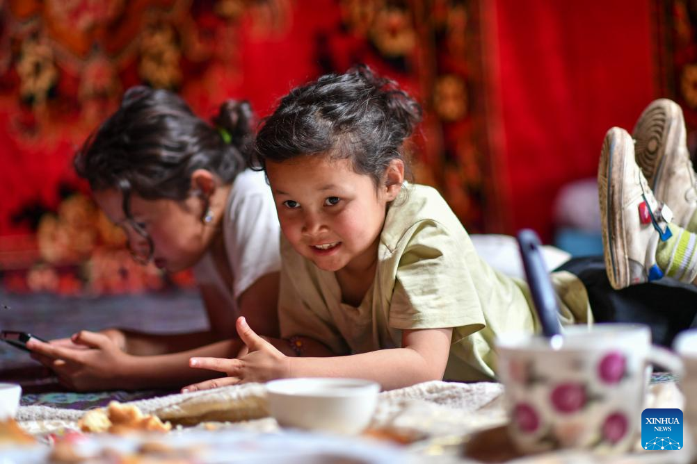 A herder and his daughter rest at home at Solbastiao alpine pasture in the Tianshan Mountains area in Miaoergou Township of Changji, northwest China's Xinjiang Uygur Autonomous Region, Aug. 14, 2023. (Xinhua/Hu Huhu)