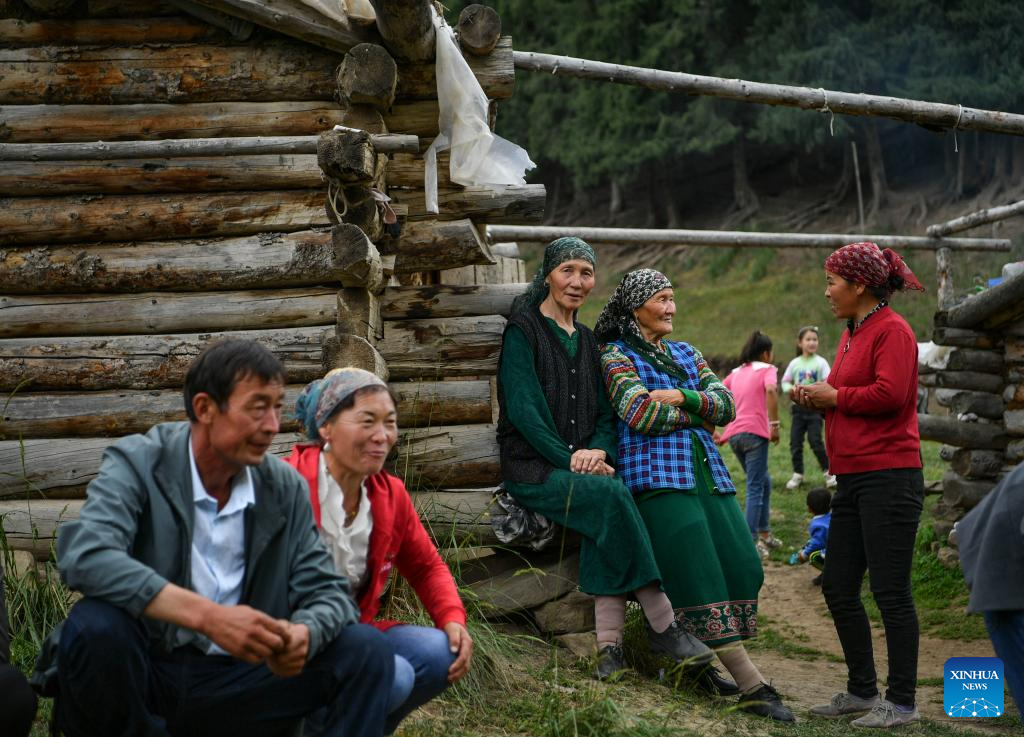 Herders get together at Solbastiao alpine pasture in the Tianshan Mountains area in Miaoergou Township of Changji, northwest China's Xinjiang Uygur Autonomous Region, Aug. 12, 2023. (Xinhua/Hu Huhu)