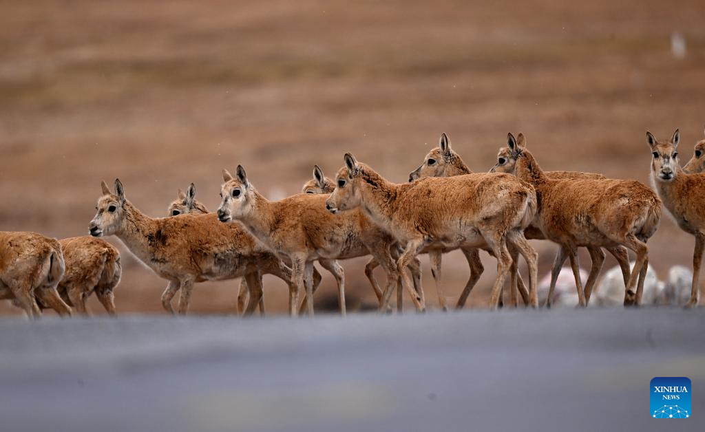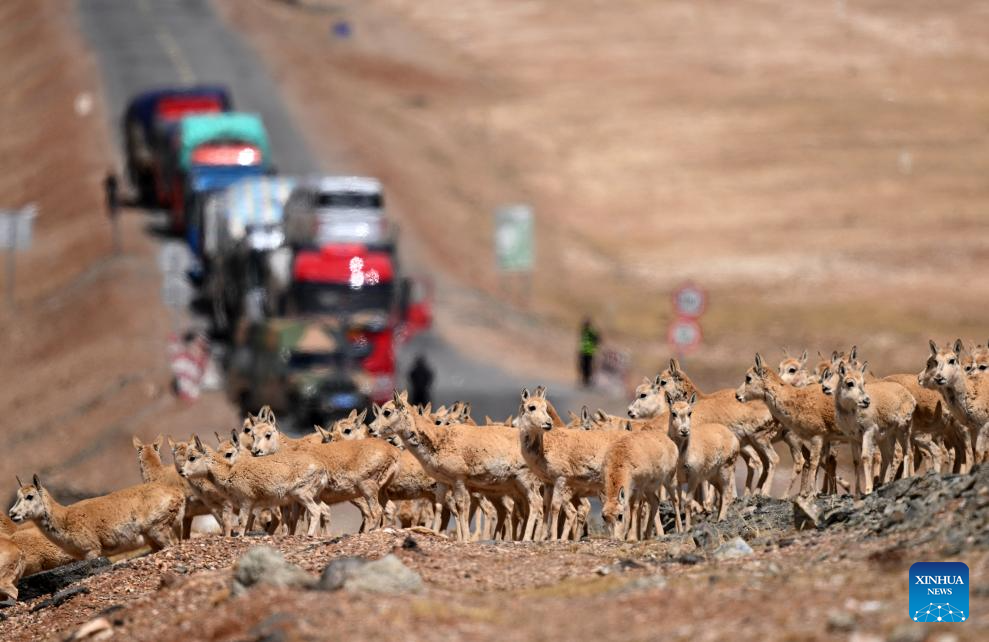A group of pregnant Tibetan antelopes pass through the Qinghai-Tibet Highway and head towards the Drolkar Lake area in Hoh Xil, northwest China's Qinghai Province, May 29, 2023. (Xinhua/Zhang Hongxiang)