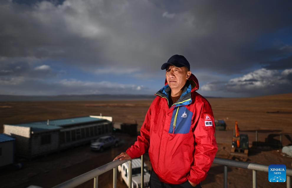 Guo Xuehu, deputy head of the preservation station of Drolkar Lake, poses for photos at the Drolkar Lake protection station in Hoh Xil, northwest China's Qinghai Province, June 17, 2023. (Xinhua/Zhang Hongxiang)