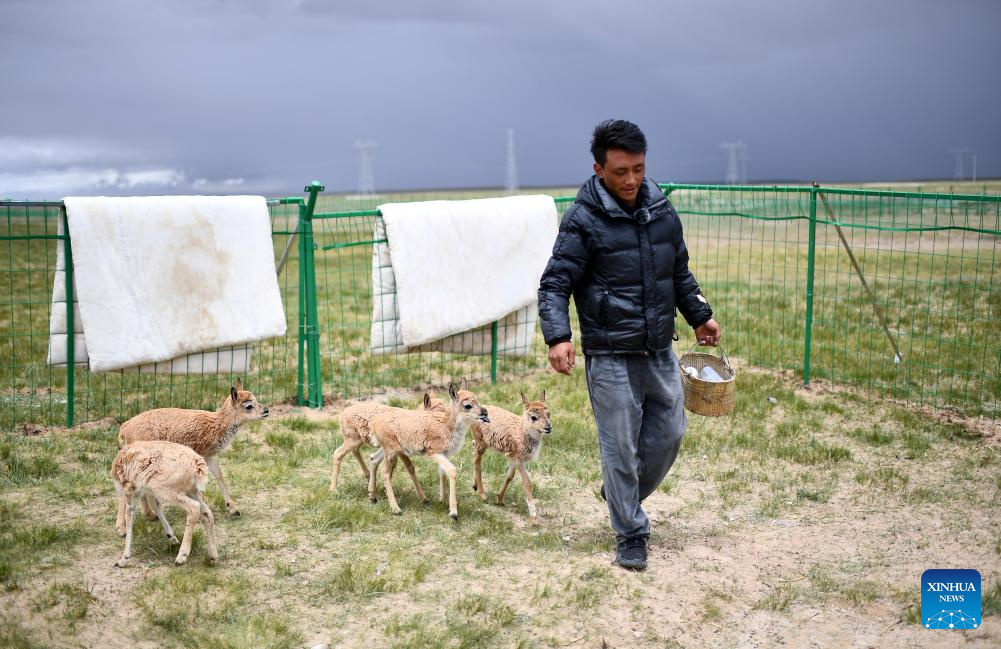 A staffer of the Hoh Xil management office is pictured with rescued Tibetan antelope calves in Hoh Xil, northwest China's Qinghai Province, July 28, 2023. (Xinhua/Zhang Hongxiang)