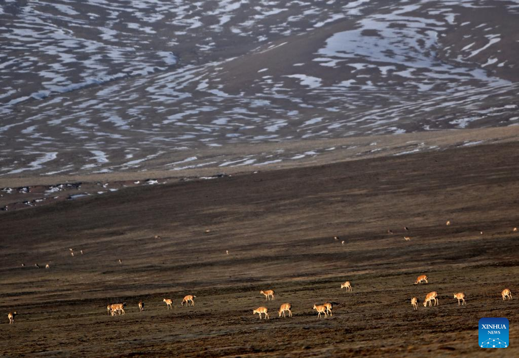 Tibetan antelopes are pictured at the Drolkar Lake area in Hoh Xil, northwest China's Qinghai Province, June 18, 2023. (Xinhua/Zhang Hongxiang)